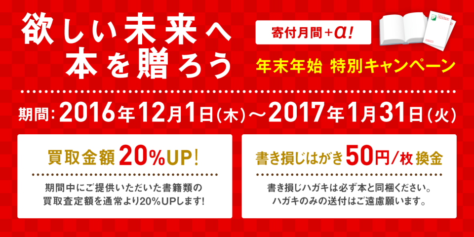 2017年01月07日 書き損じハガキを集めています 2017年01月07日 今日から3連休の方も多いかと思います。 年賀状の書き損じハガキはありませんか? 不要になった本といっしょにお送りください。 5冊以上から送料無料・電話一本で取りに来てくれる 「ぼぼん(募本)プロジェクト」にぜひ、ご協力をお願いいたします! 1.期間:2016年12月1日(木)~2017年1月31日(火) 2.内容: ①買取金額20%UP ②書き損じハガキ50円/枚 (必ず本と同梱ください。ハガキのみの送付は御遠慮願います。) 「欲しい未来へ本を贈ろう ~寄付金額20%アップキャンペーン」 ぼぼんプロジェクトを展開する株式会社バリューブックスの 寄付月間特別キャンペーンとして、 いつもの古本寄付が12月、1月の2か月間、パワーアップします! ※到着分となりますので、1月末の発送はお早めに…※ 関連リンク:http://www.bobon.jp/index.html
